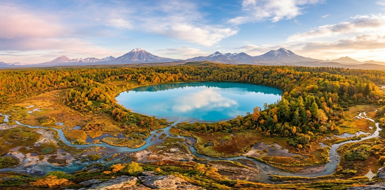 **“地热蓝湖的澄澈纯净感与秋日林海的暖调氛围感”**。利用俄罗斯堪察加半岛标志性的地热蓝湖与秋日彩林地貌,创造出置身地球秘境的治愈与鲜活感,定格日出时分晨光铺满彩林蓝湖的梦幻时刻。
