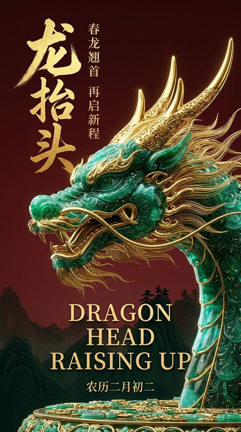 "文案设计": "左上角书法体‘龙抬头’印金效果;右侧副标题‘春龙翘首 再启新程’;下方英文‘DRAGON HEAD RAISING UP’采用衬线体分三行排版;底部横排小字‘农历二月初二’",