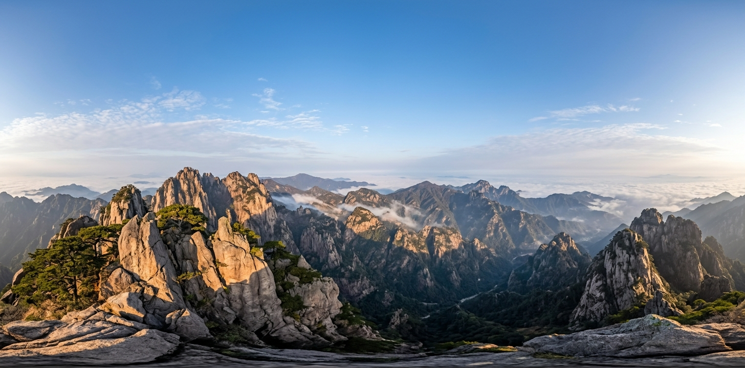 本提示词精准还原中国黄山核心景区的花岗岩峰林日出奇观,以高空无人机视角,完整呈现 360° 球形全景下的黄山山岳盛景。画面核心聚焦陡峭的花岗岩峰林,岩壁纹理与节理清晰可见,在日出暖光的照射下,岩石呈现出暖橙与深灰的明暗对比,立体轮廓被极致放大;远处的层峦叠嶂逐渐融入云海之中,清晨的渐变蓝天搭配丝状流云,完整呈现黄山 “奇松、怪石、云海” 的核心特色,兼具奇峻与仙气的东方山水意境。本提示词生成内容可用于文旅宣传素材、国风自然内容创作、VR 景区漫游、地理教学素材等多个场景。