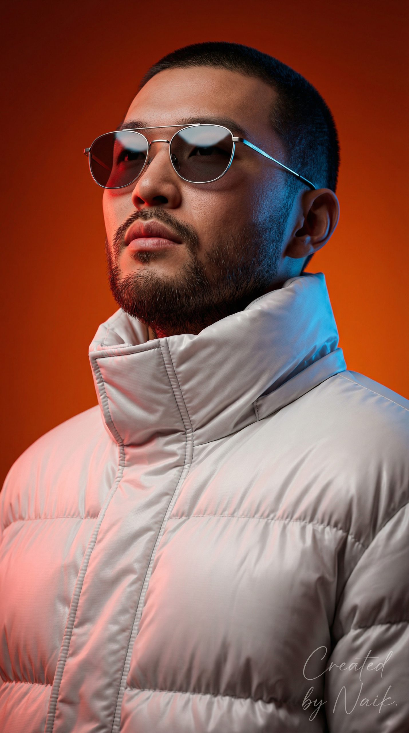 "内容描述": "一幅极致写实的电影级时尚肖像。一位年轻的东亚男性(基于参考图,面部轮廓硬朗、留着精致的短胡须)正以略微低角度仰视,神情透着一种强大的自信。构图为紧凑的上半身特写,头部微仰,极力突显其下颌线与胡须的立体构造。背景是极具现代视觉冲击力的深橙到暖红的渐变色摄影棚。光影采用了极具戏剧性的电影双色布光:一侧是浓郁的暖红/橙光,另一侧是清冷的电光蓝(Teal)轮廓光,在面部与胡须边缘形成惊人的明暗与冷暖对碰。他穿着一件充满未来感的白色超大号廓形羽绒服,具有夸张的绗缝分区和高保护性立领,面料呈现出顶级机能时尚的细微光泽与真实的褶皱质感。他戴着细银框墨镜,镜片映射出周围的彩色光影。超写实皮肤肌理,每一处毛孔、胡须发丝及唇部纹理都清晰可见。画面右下角带有淡白色、半透明的优雅手写体签名“Created by Naik”。8K极致解析度,顶级时尚杂志社论风格。",