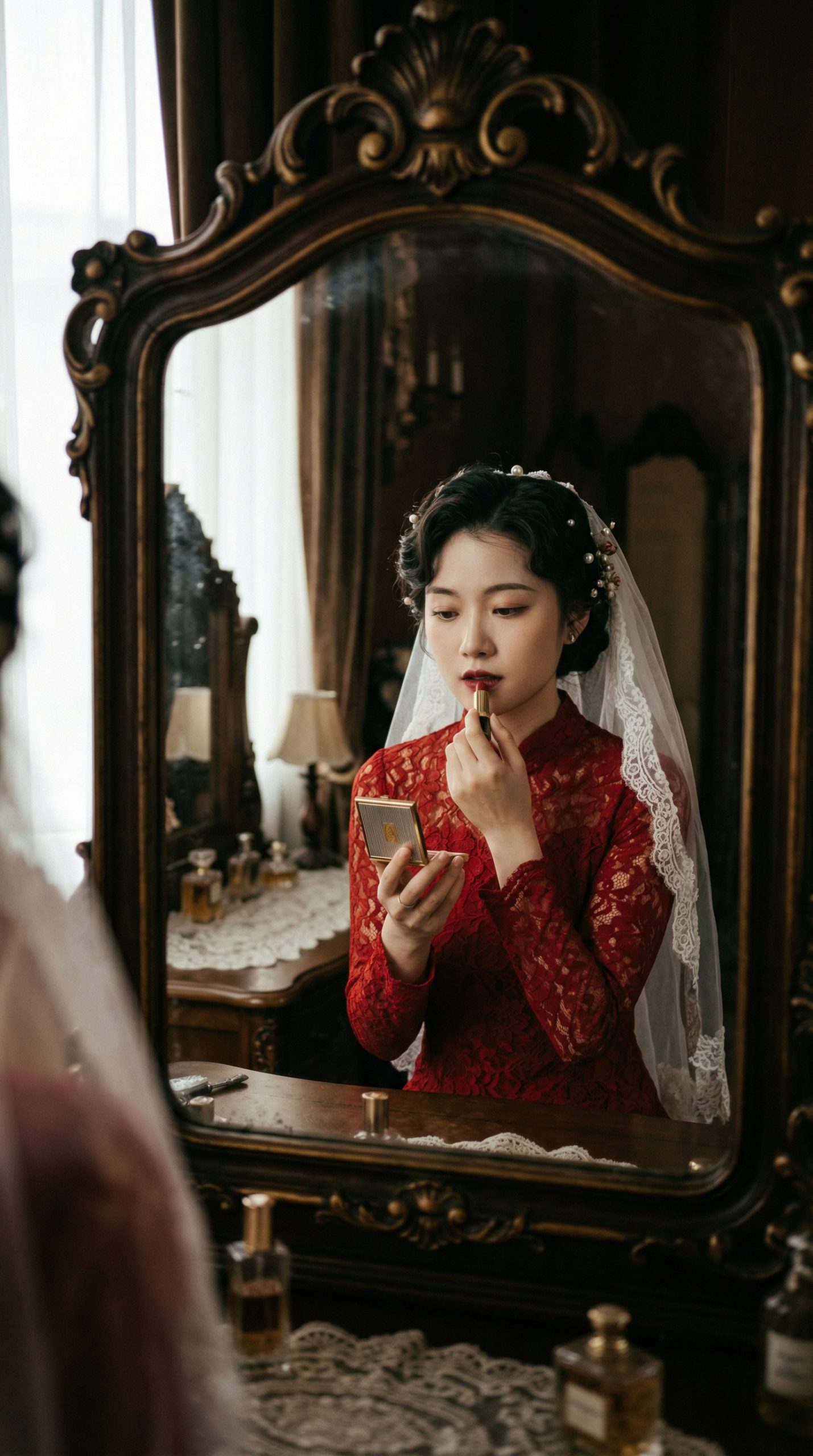 "内容描述": "一位年轻的亚洲女性穿着复古红色蕾丝婚纱,站在古董镜子前,镜头捕捉其在镜中的倒影。她正拿着小粉盒细致地涂抹口红,眼神温柔而内省。",