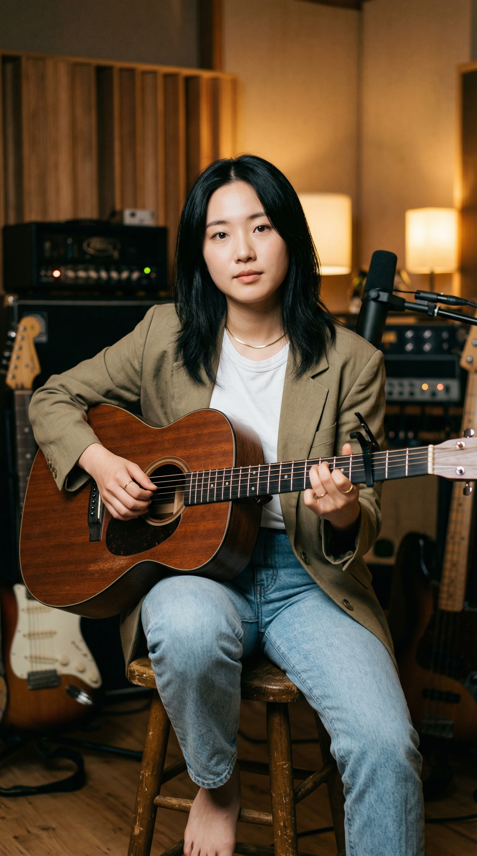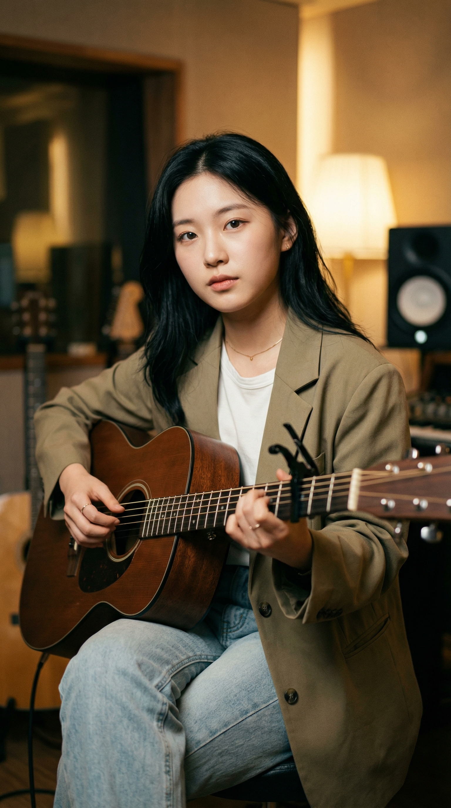 "关键要素": "东亚女性面孔,木质吉他,黑色移调夹,卡其色西装外套,水洗蓝牛仔裤,专注的眼神,精致的配饰(锁骨链、细戒指),温暖、私密的录音棚,模糊的背景(乐器、音响、暖色调灯光),柔和的侧光,电影感的颗粒感。",