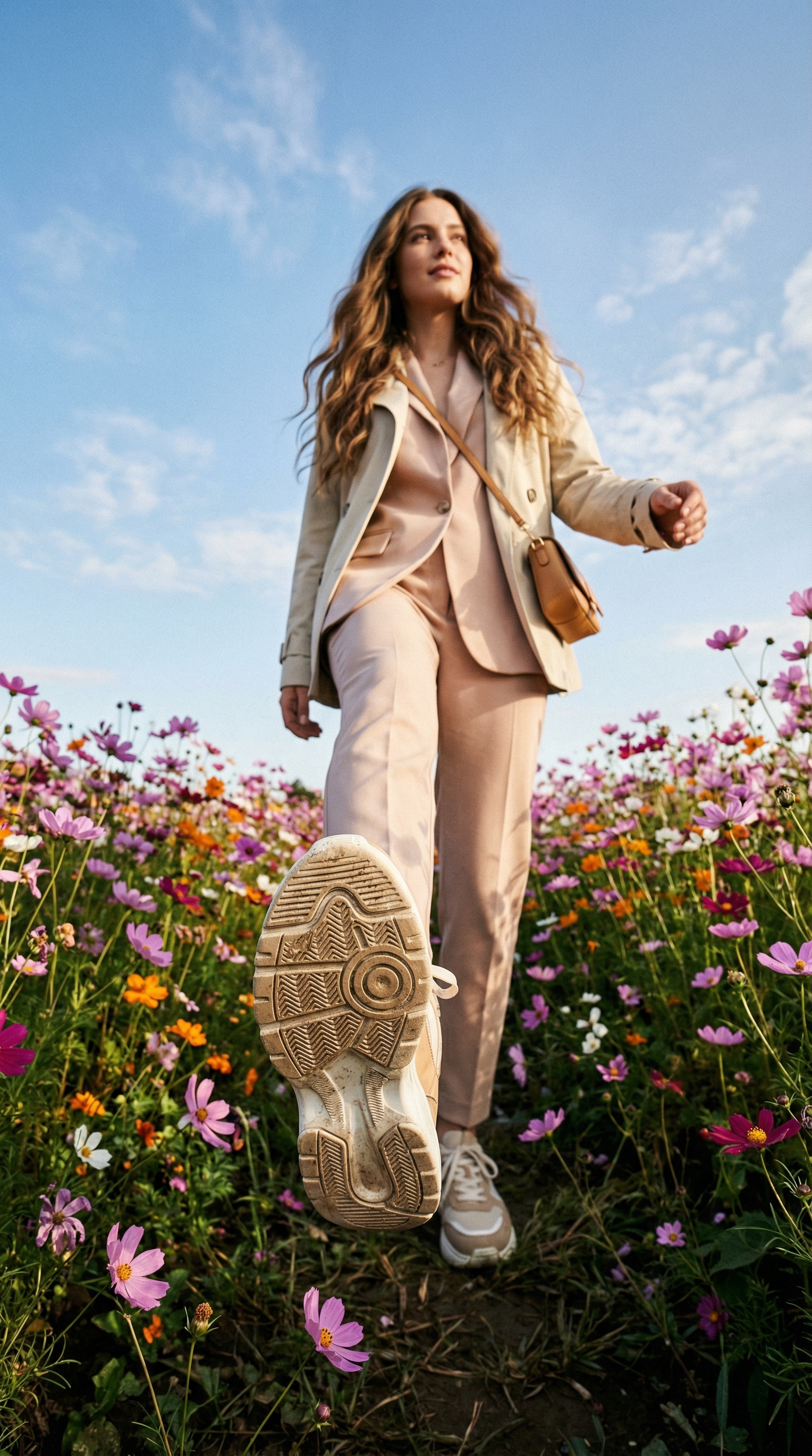 "内容描述": "一位年轻时尚的女性漫步在色彩斑斓的花海中,镜头采用极低角度,捕捉她迈步瞬间的动感。鞋底细节占据前景,形成强烈的透视冲击力。",